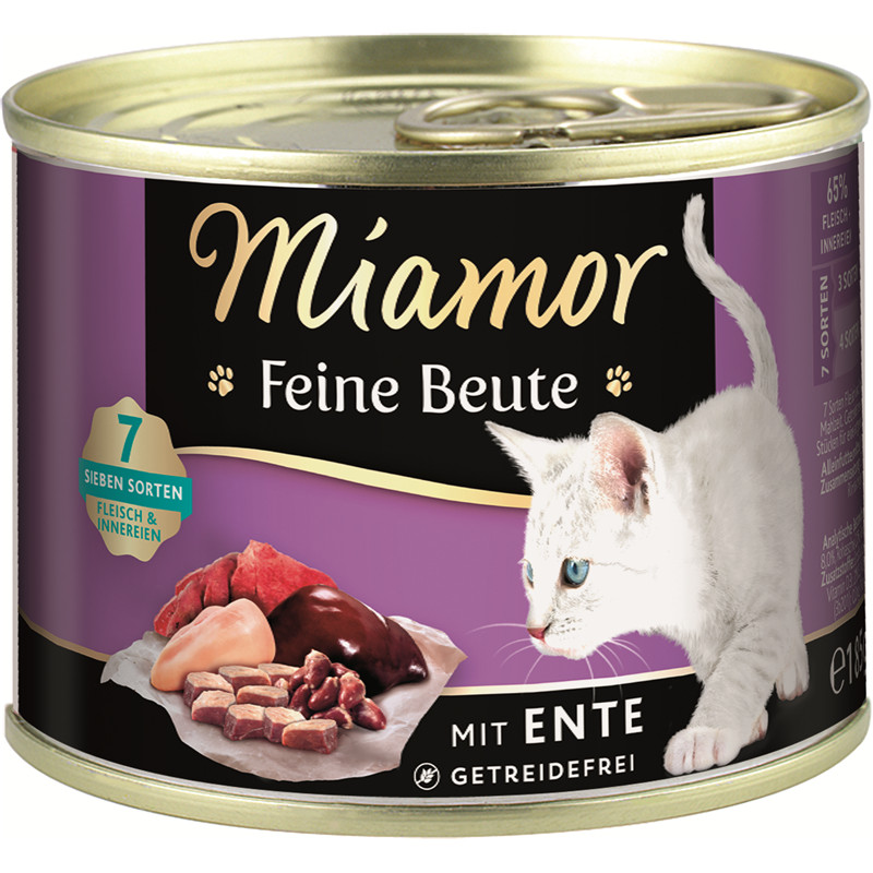 Miamor Feine Beute - 7 Sorten Fleisch & Innereien. 65% Fleisch & Innereien. Miamor Feine Beute: 7 Sorten für 7 Leben. Eine ausgewogene Fleischkomposition für ein langes Katzenleben. Getreidefrei und artgerecht, denn Katzen sind von Natur aus Fleischfresser (Carnivore).