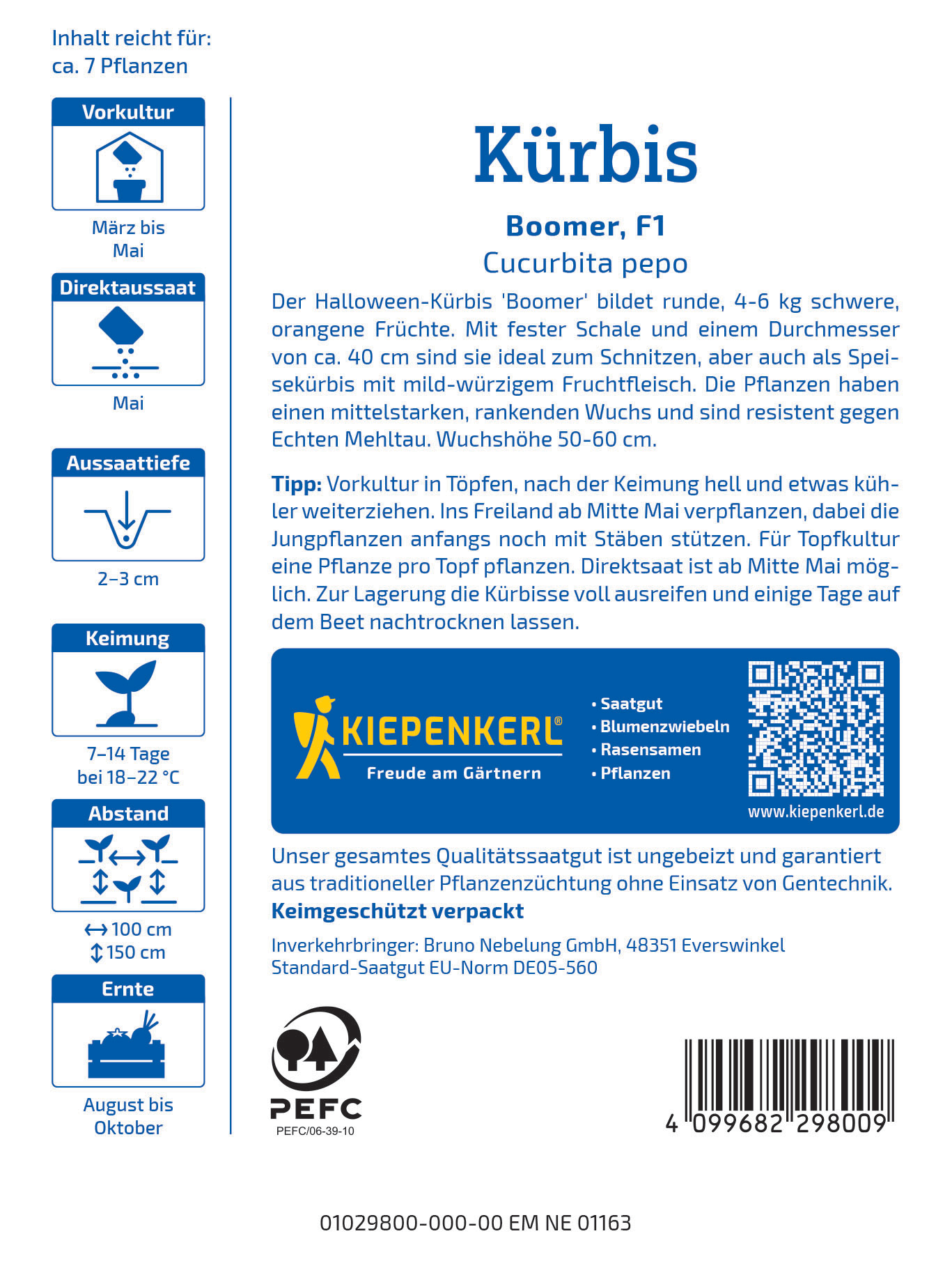 Der Halloween-Kürbis 'Boomer' bildet runde, 4-6 kg schwere, orangene Früchte. Mit fester Schale und einem Durchmesser von ca. 40 cm sind sie ideal zum Schnitzen, aber auch als Speisekürbis mit mild-würzigem Fruchtfleisch. Die Pflanzen haben einen mittelstarken, rankenden Wuchs und sind resistent gegen Echten Mehltau. Wuchshöhe 50-60 cm.