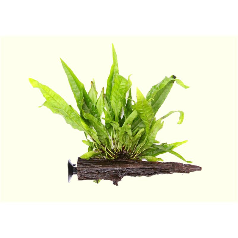 Bepflanztes Wurzelholz mit Saugnäpfen sind speziell für die Anbringung an der Aquariumscheibe konzipiert. Die Wurzeln ragen direkt in die Unterwasserlandschaft hinein und schaffen somit eine sehr besondere Anmutung. Vor allem in kleineren Aquarien wirken die Hölzer wie tote Baumstämme, die in die Wasserwelt hineinragen. Wie die beliebten Anubias wächst auch Microsorum pteropus hervorragend auf dem Wurzelholz. Um das Größenwachstum etwas zu limitieren, kann man größere Blätter in unregelmäßigen Abständen herausschneiden. Auch ein kompletter Rückschnitt ist möglich – es dauert jedoch schon etwas länger, bis die Pflanze wieder einen buschigen Habitus erreicht hat.