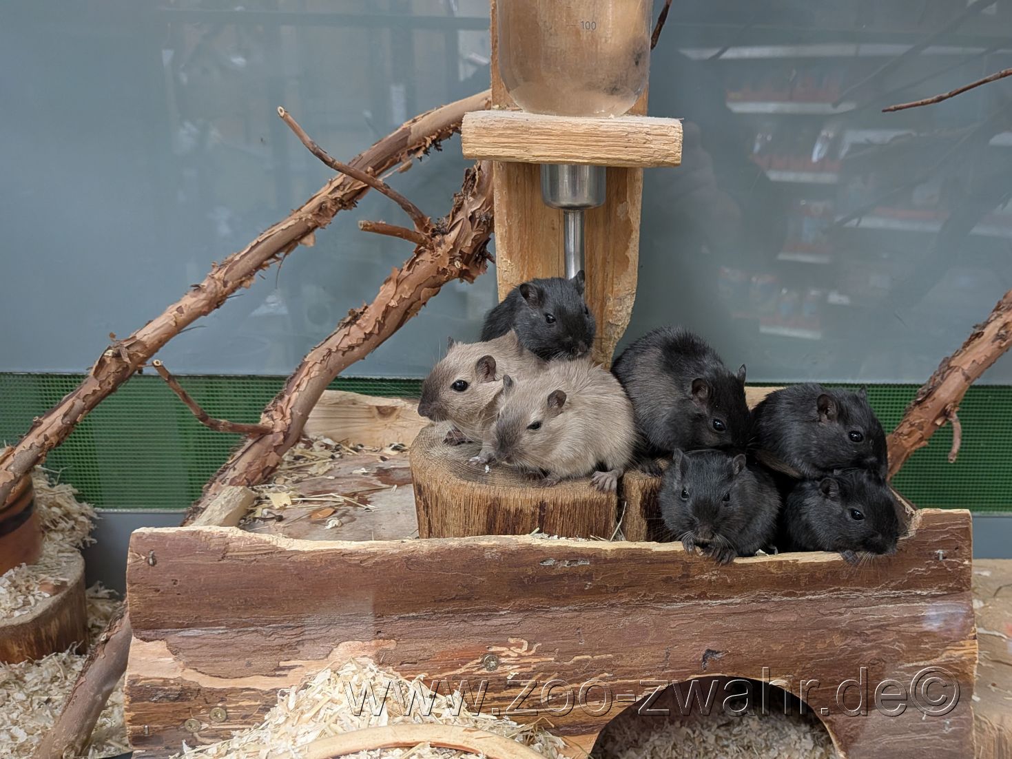 Der Käfig wird mit einer hohen Einstreu (die Tiere graben gern), einem Häuschen als Rückzugsmöglichkeit, einem Futternapf, einer Trinkstelle und einem Sandbad eingerichtet. Mit Wurzeln, Ästen, Grasnestern, Weidenbrücken .... läßt sich der Käfig abwechslungsreich gestalten.