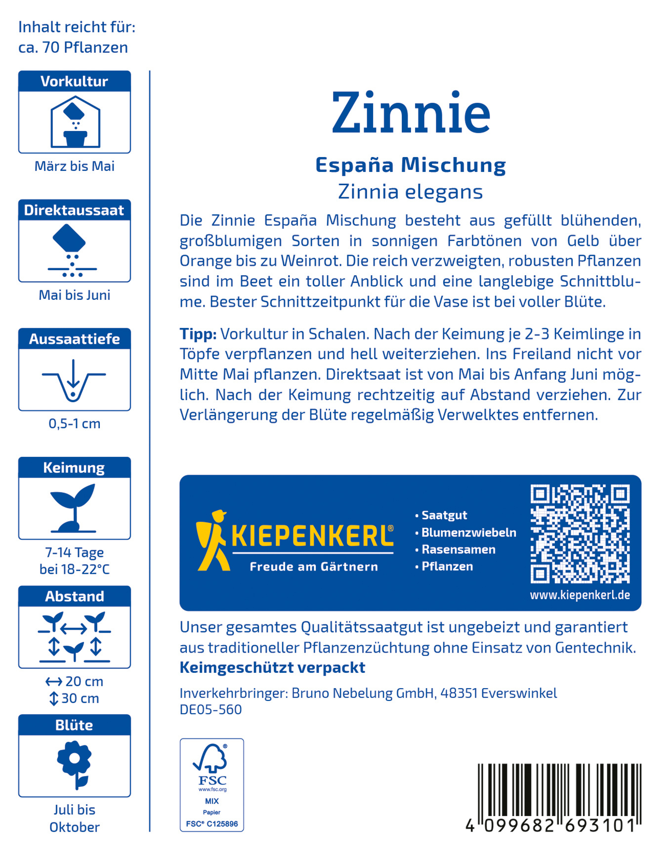 Die Zinnie España Mischung besteht aus gefüllt blühenden, großblumigen Sorten in sonnigen Farbtönen von Gelb über Orange bis zu Weinrot. Die reich verzweigten, robusten Pflanzen sind im Beet ein toller Anblick und eine langlebige Schnittblume. Bester Schnittzeitpunkt für die Vase ist bei voller Blüte.